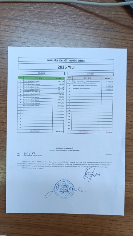 2024-2025 Okul Aile Birliği Tahmini Bütçe